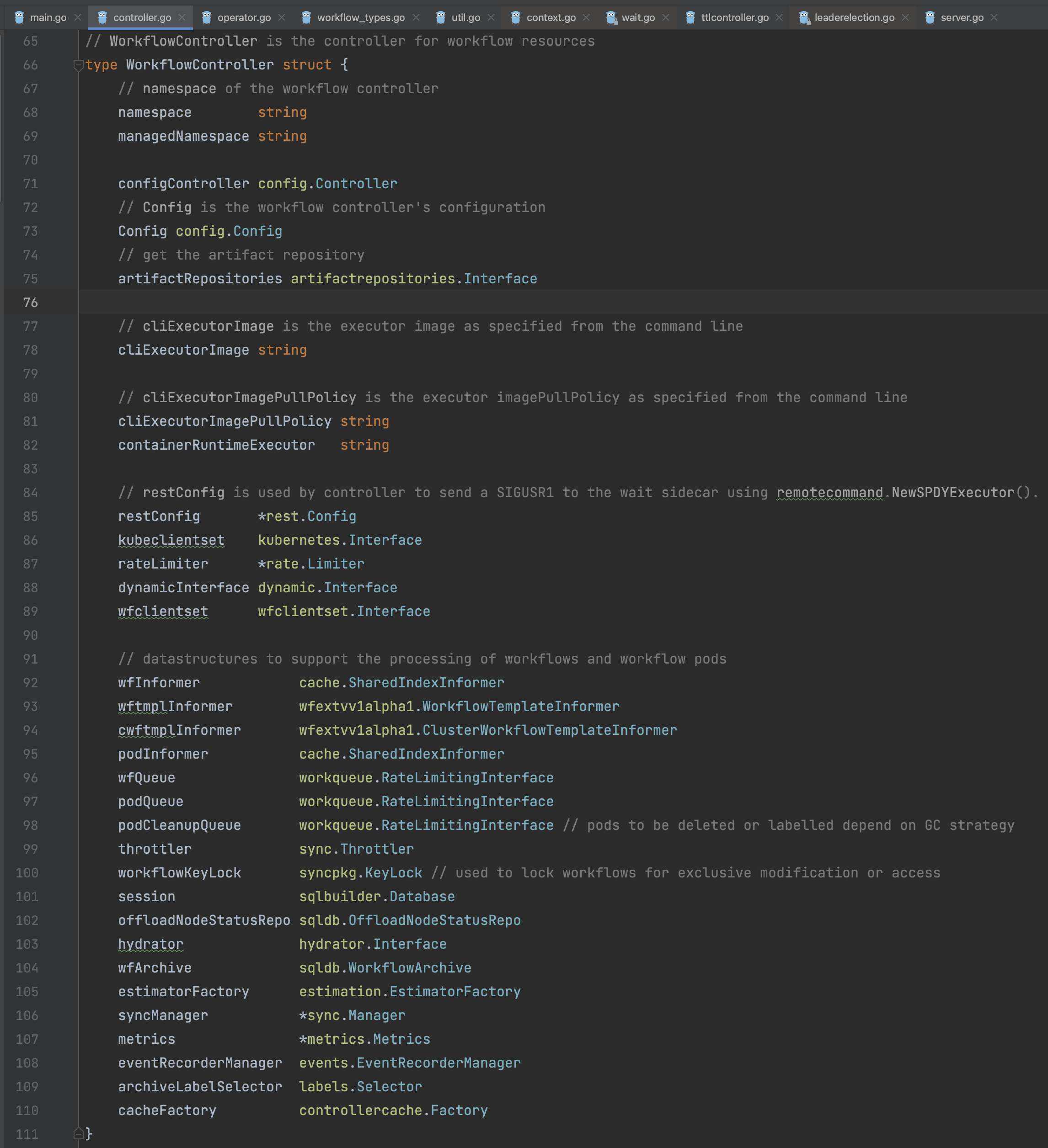 WorkflowController | ![]() 用于 Workflow Controller流程控制的核心数据结构对象,封装了主要的Controller处理逻辑、维护着核心的相关业务逻辑对象、数据队列、KubeClient对象、Informer对象等等。该结构只有一个对象实例,由主流程创建。 |