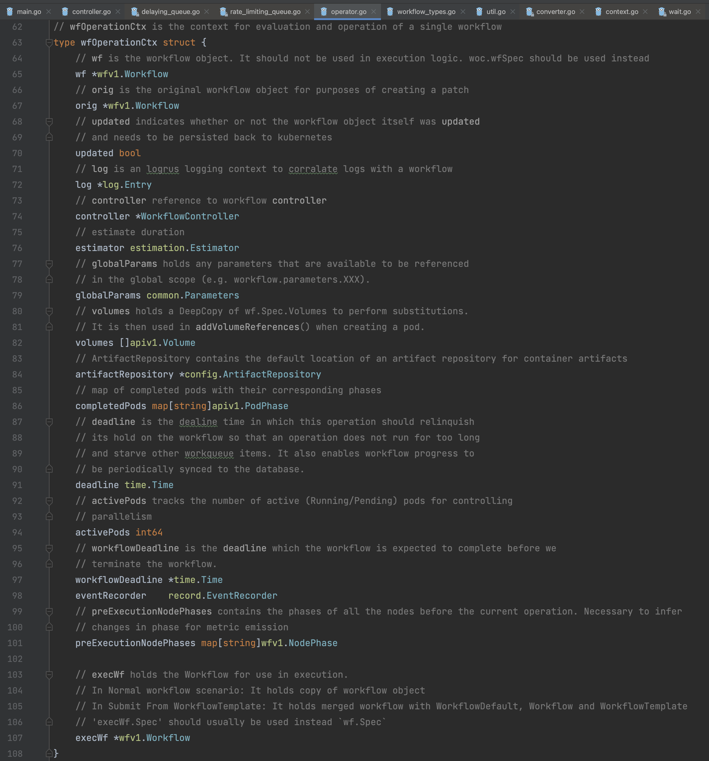 wfOperationCtx | ![]() Workflow业务逻辑封装对象。几点重要的说明: 1、 wf/orig/execWf1) wf该对象是开发者通过 yaml创建的Workflow对象的深度拷贝对象。官方注释建议运行时逻辑处理中应当使用execWf而不是wf对象,wf对象未来可能会被废弃掉。2) orig该对象是开发者通过 yaml创建的Workflow对象,任何时候开发者都不应当去修改它,该对象主要用于后续可以对Workflow的patch更新判断。3) execWf该对象是运行时逻辑处理中修改的 Workflow对象,因为Workflow对象会在逻辑处理中不断被修改更新,特别是execWf是多个模板(Wf/WfDefault/WfTemplate)的合并结构。* 关于 TemplateDefault的介绍请参考官方文档:https://argoproj.github.io/argo-workflows/template-defaults/* WfTemplate来源于templateRef配置,具体请参考官方文档:https://argoproj.github.io/argo-workflows/workflow-templates/#referencing-other-workflowtemplates2、 globalParams全局变量,类型为 map[string]string,该Workflow中的所有template共享该变量,该变量的名称也可被用于template中的模板变量。3、 update该属性用于标识当前 Workflow对象是否已更新,以便判断是否同步到Kubernetes中。4、 node在 woc处理流程的源码中会出现node的概念,这里的node是Steps/DAG中的执行节点,每一个节点都会运行一个Pod来执行。注意它和Template不是一个概念。 |