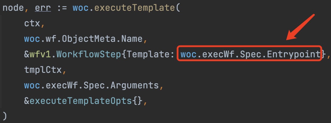 woc.executeTemplate方法开始执行Workflow中的Template,入口为woc.execWf.Spec.Entrypoint。