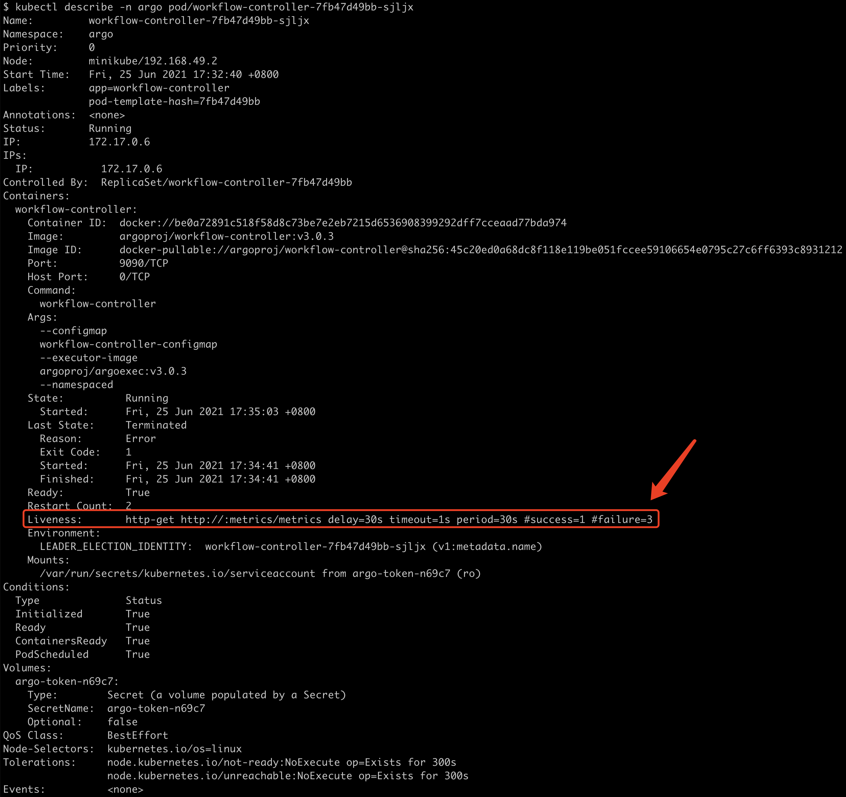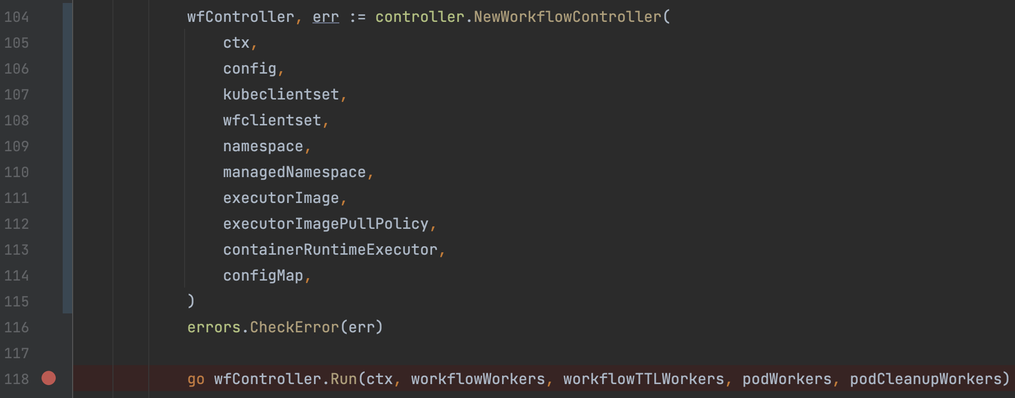 Controller启动是由Cobra命令行组件管理,通过workflow-controller命令执行启动。启动后创建WorkflowController对象,并执行该对象的Run方法将流程的控制交给了该对象维护。这里同时会创建一个HTTP Serever:``6060/healthz,用于Controller容器的健康检查。不过,从执行结果来看,6060端口的健康检查服务并没有被使用,而是使用的后续开启的Metrics Http Server作为健康检查的地址。