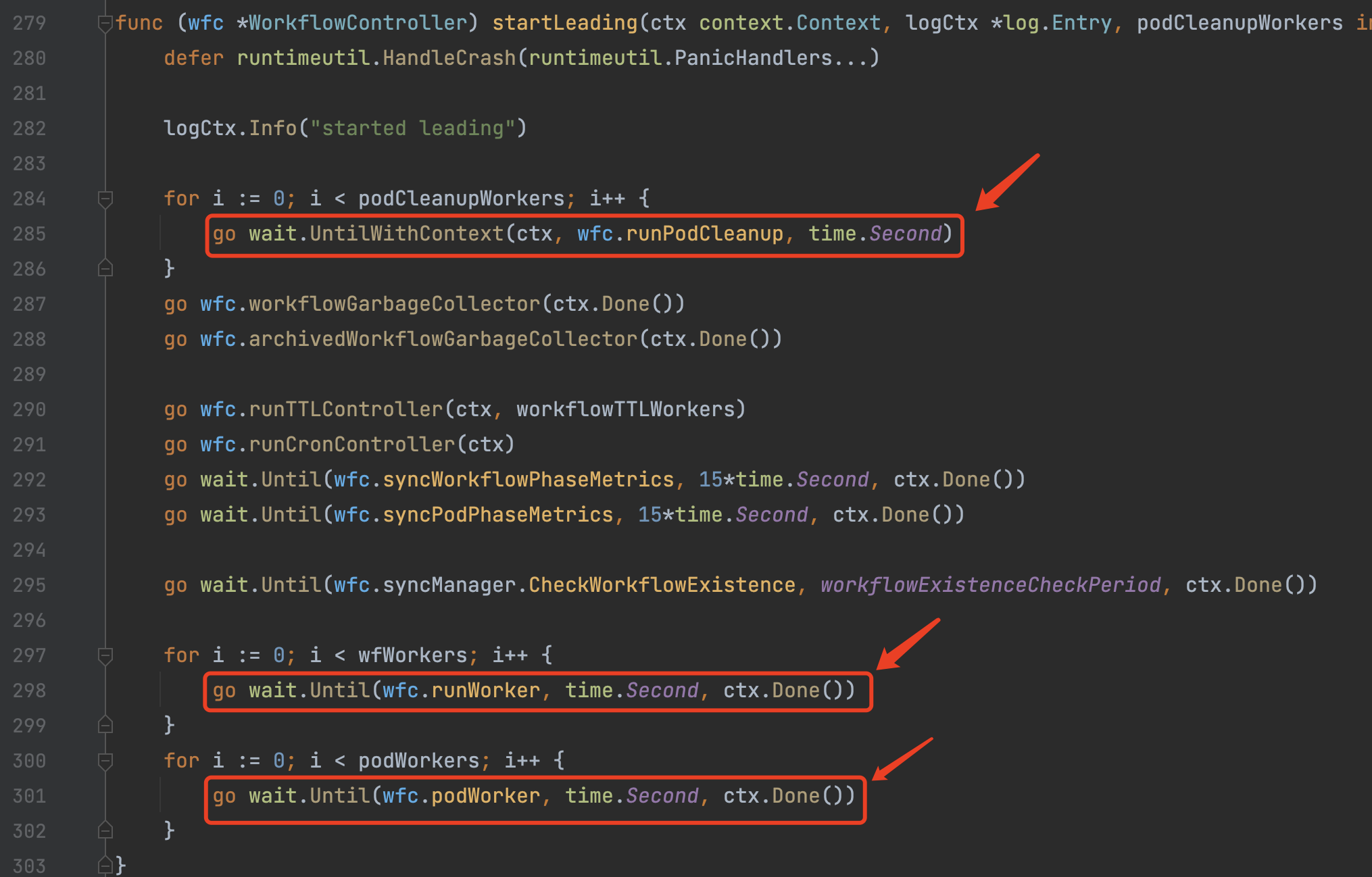 Kubernetes Client Leader选举逻辑,当选出Leader时,在Leader节点通过OnStartedLeading回调进入wfc.startLeading逻辑。 wfc.startLeading中开始队列的开启、异步任务的创建,这里使用了wait.Until方法,该方法会每隔一段时间创建一个异步的协程执行。- 这里涉及到3个队列的