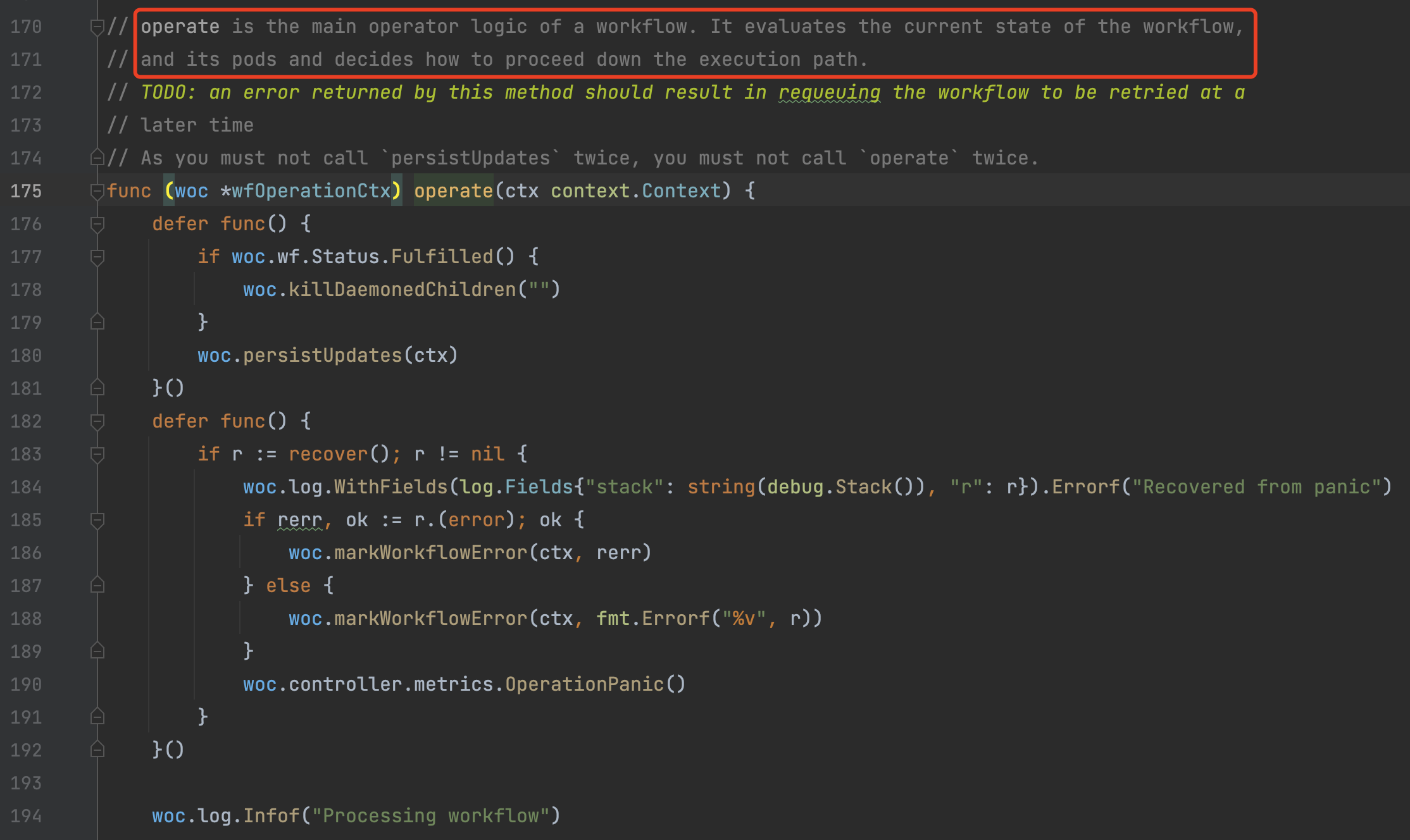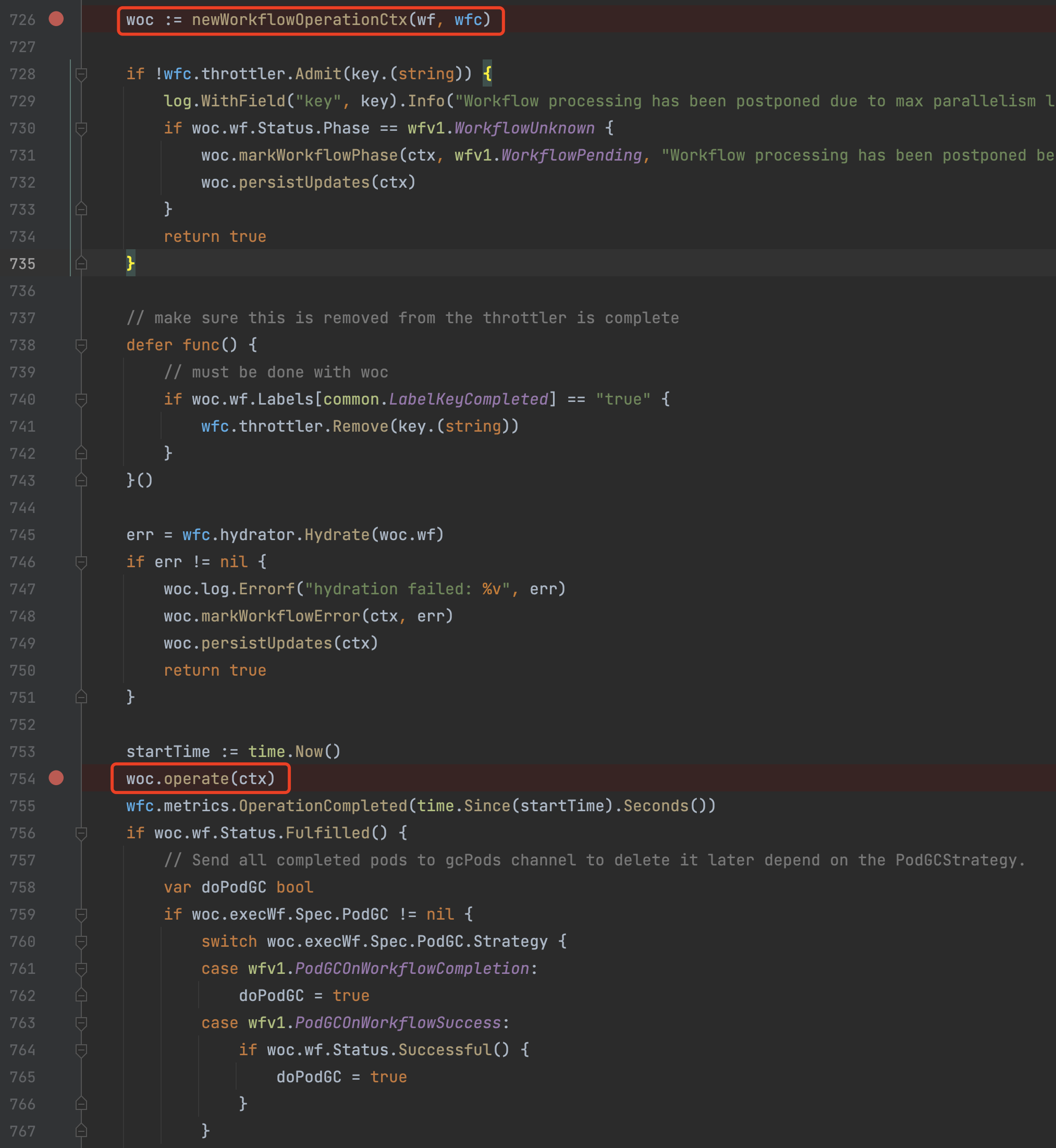 该方法会创建核心的wfOperationCtx对象,该对象是在Workflow处理中核心的上下文流程和变量管理对象,接下来wfc(WorkflowController)会将业务逻辑的流程控制转交给woc(wfOperationCtx)来管理。我们可以这么来理解,wfc是一个Kubernetes Controller,用于CRD的实现,负责与Kubernetes Event打交道。woc负责内部的业务逻辑、流程、变量管理,因此woc是Workflow处理中的核心业务逻辑封装对象。