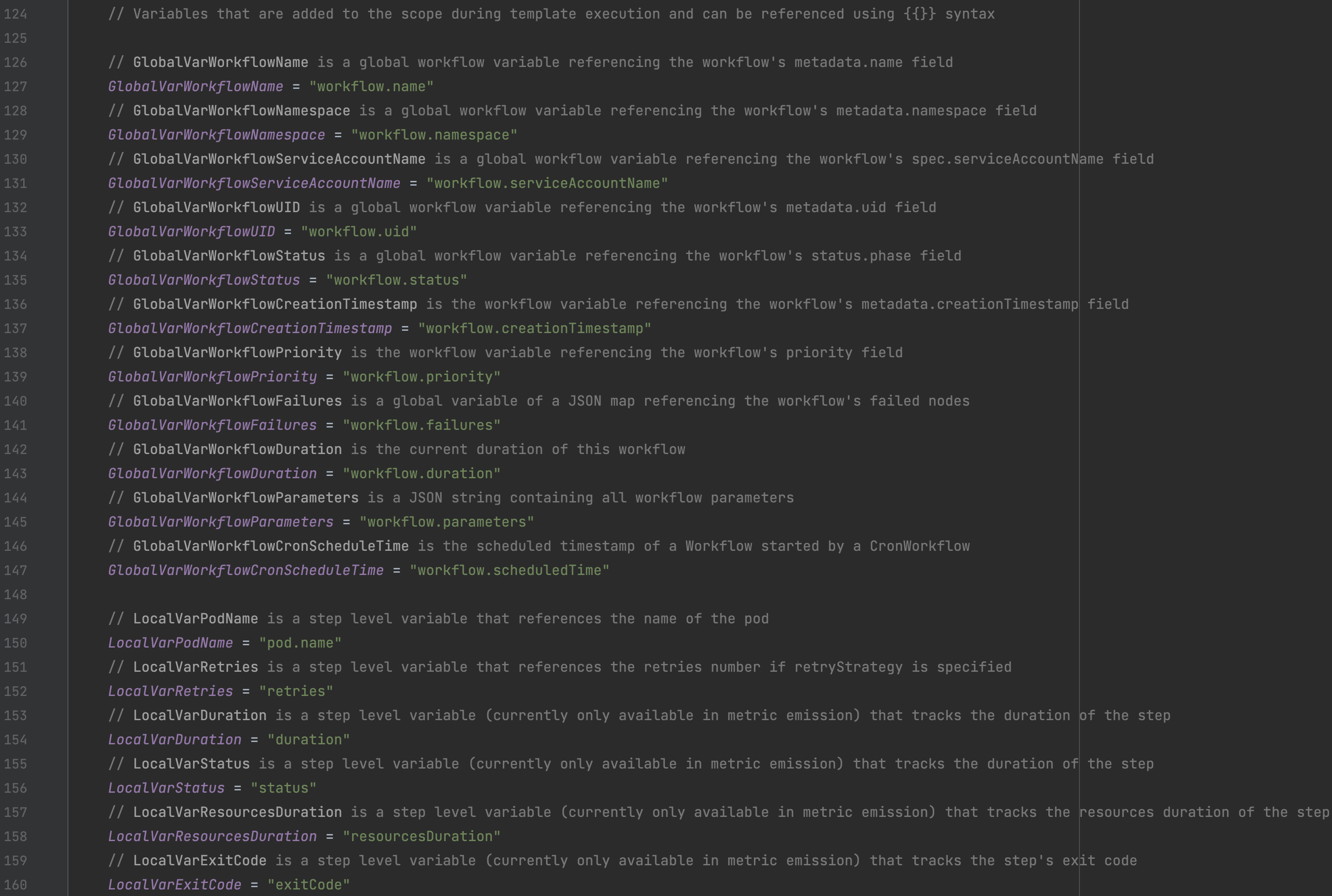 在Argo Workflow Controller内部中的变量分为两种:一种是Workflow全局生效的变量(globalParams),一种是当前Template生效的本地变量(localParams)。其中全局变量也包括开发者自定义的输入/输出变量、Workflow Annotations&Labels,这些变量也是能被Workflow全局中访问。两种变量由于访问方式不同,因此不会相互冲突。