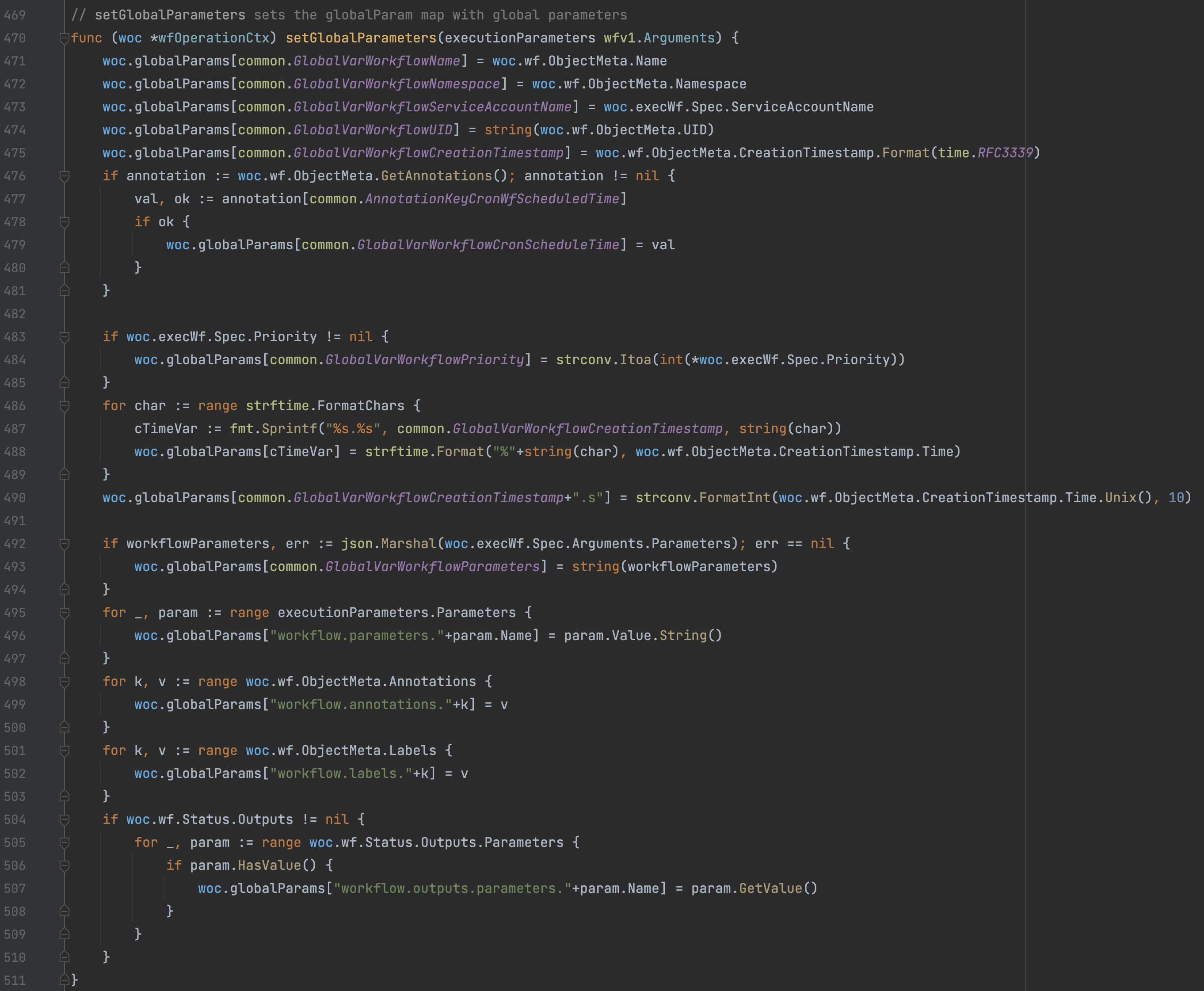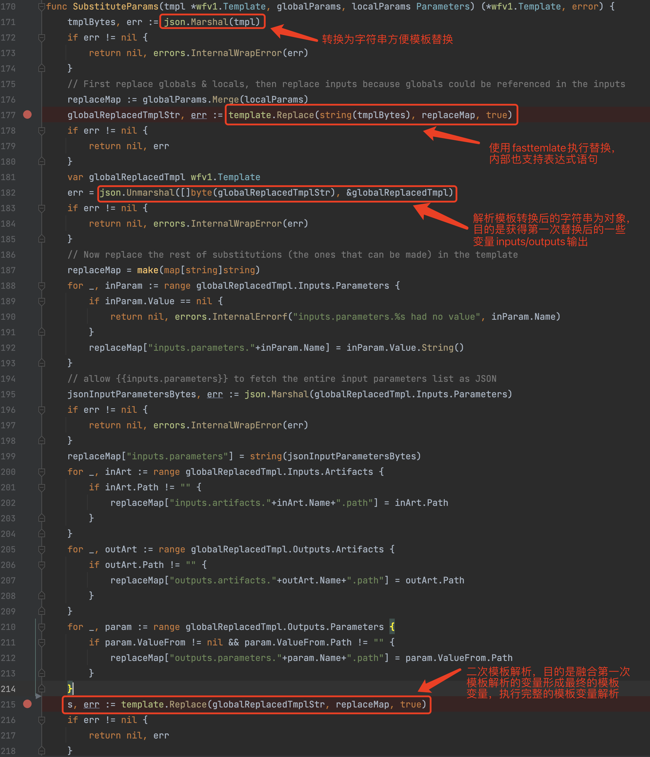 Argo Workflow Controller的变量其实主要是使用到模板解析中。在Controller处理流程中,会看到多次的json.Marshal/json.Unmarshal操作:通过json.Marhsal将Template对象转为字符串,再通过模板解析将字符串中的变量替换为真正的内容,随后再将字符串json.Unmarshal到该对象上覆盖原有属性值。这种设计也使得Workflow Template中的变量对应的内容必须是一个具体的值(字符串/数字等基本类型),不能是一个复杂对象,否则无法完成模板解析替换。