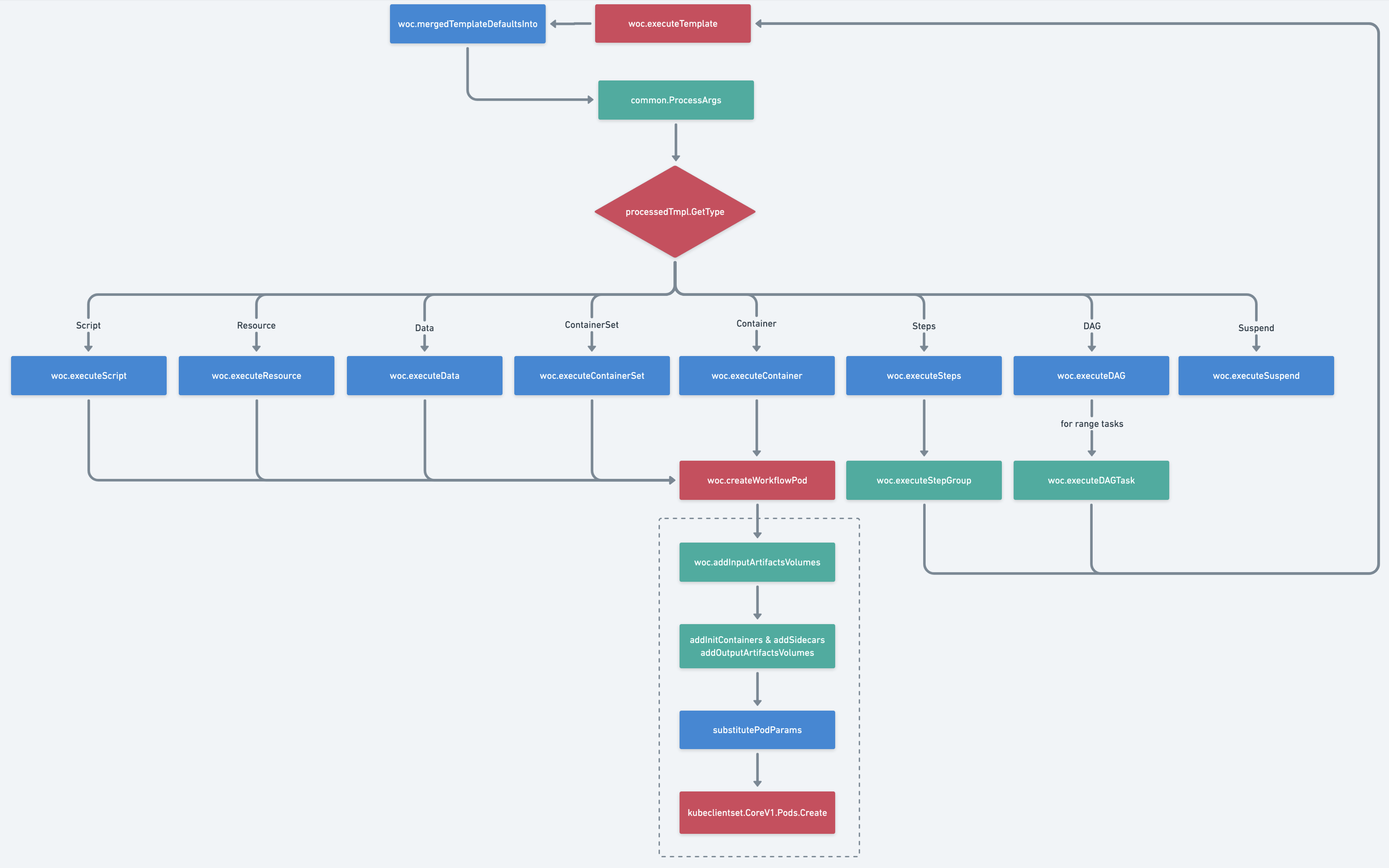 Steps&DAG类型的Template通过woc.executeSteps、woc.executeDAG方法实现,内部会对多个Template的流程进行控制,循环调用woc.executeTemplate方法执行每个Template。