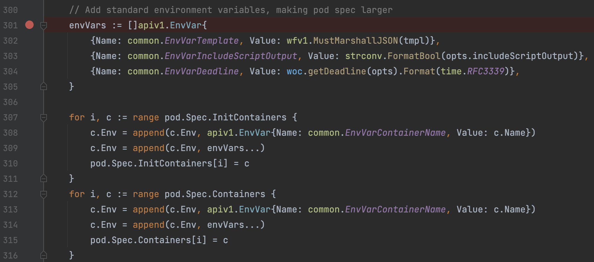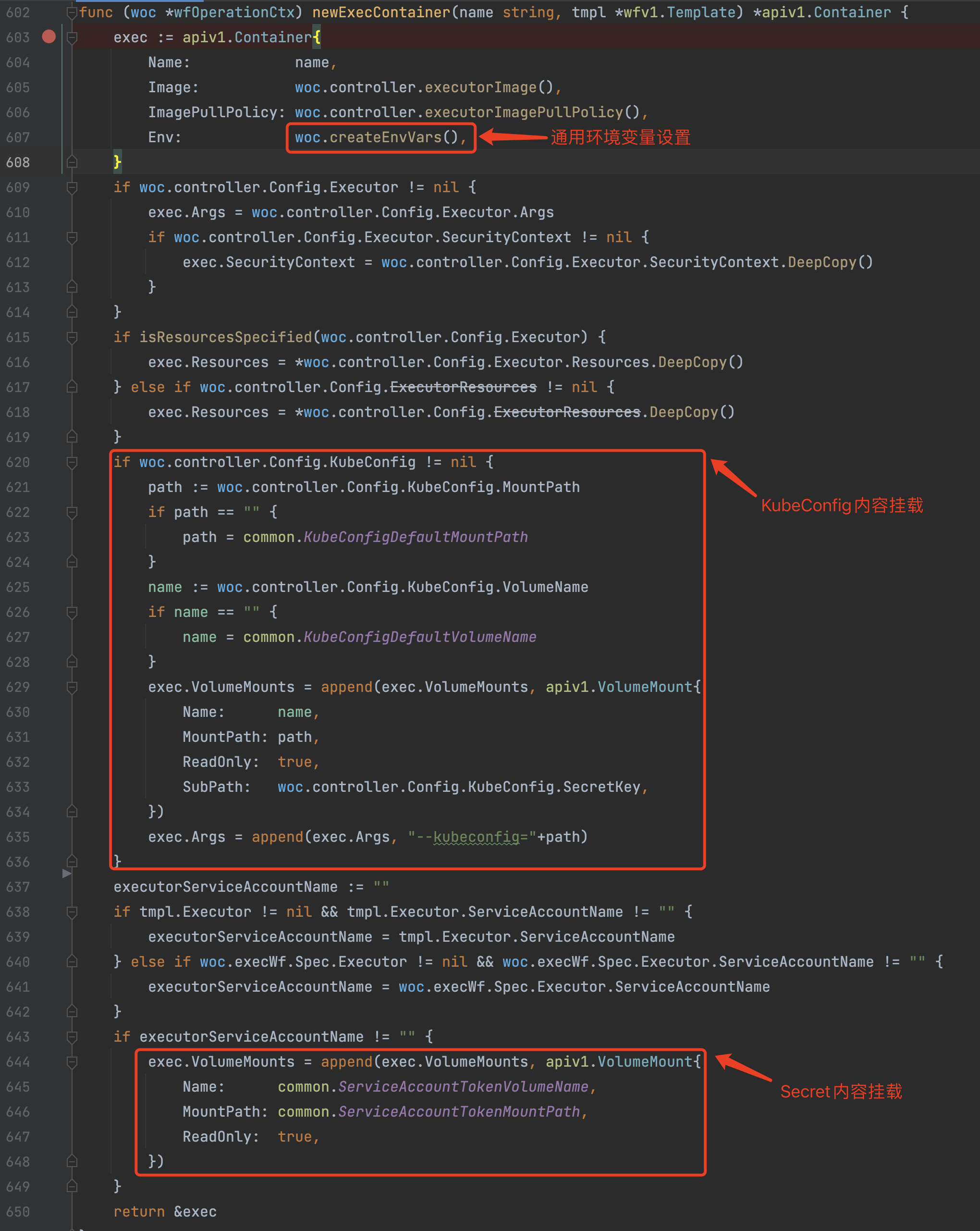 a)根据条件创建Init/Wait Containers,内部都是通过 woc.newExecContainer 创建容器,容器创建时并设置通用的环境变量以及Volume挂载。