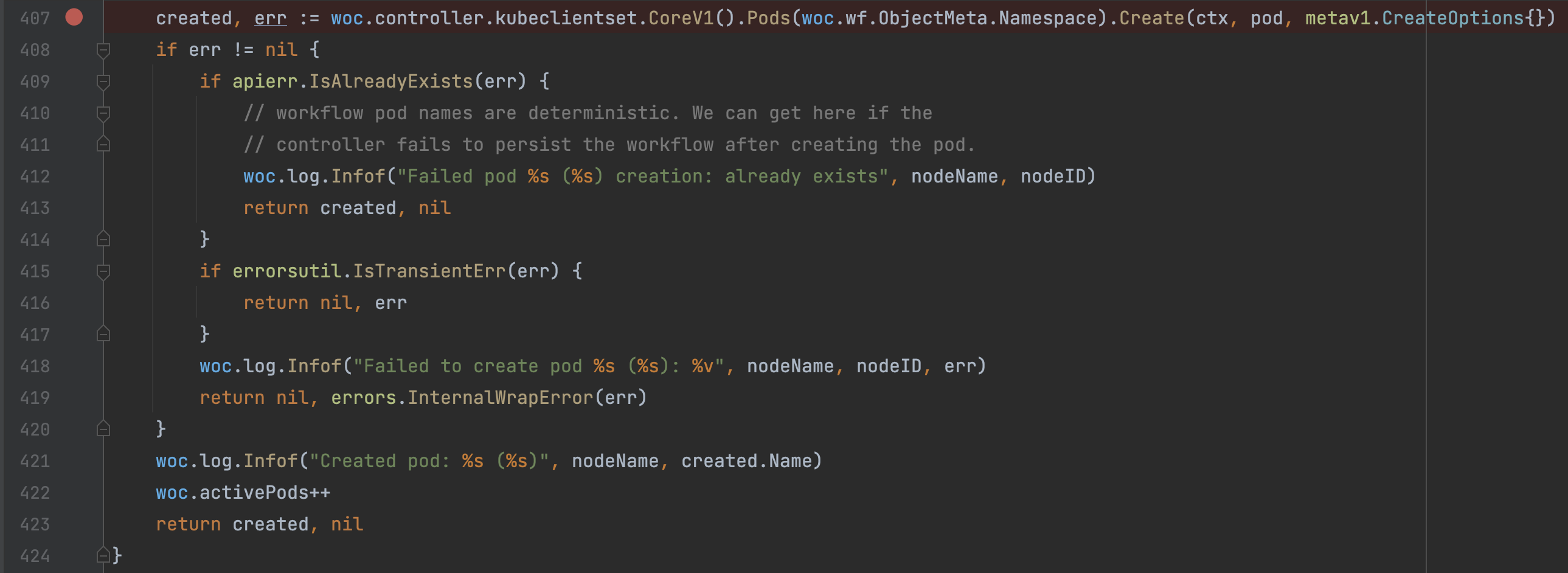 ContainerSet类型的Template通过woc.executeContainerSet方法实现,多个容器的创建通过调用woc.createWorkflowPod创建Pod到Kubernetes中。关于ContainerSet类型的Template介绍请参考:https://argoproj.github.io/argo-workflows/container-set-template/
