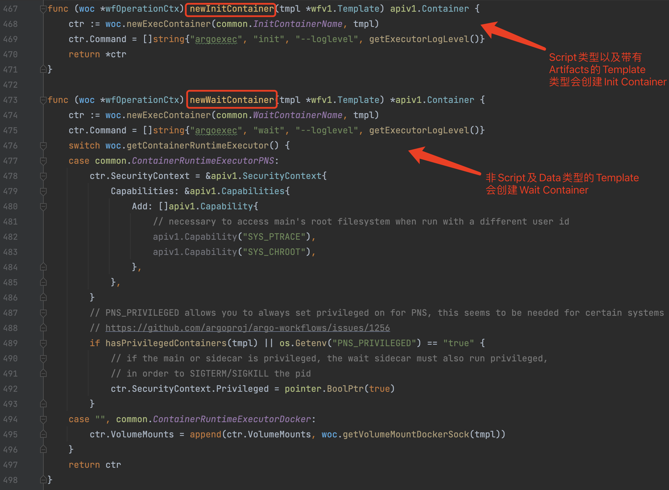 只有在Template类型为Script或者带有Artifacts功能时,Argo Workflow Controller才会为Pod创建Init Container,该Container使用的是argoexec镜像,通过 argoexec init 命令启动运行。Init Container主要的职责是将Script的Resource读取或将依赖的Artifacts内容拉取,保存到本地挂载的共享Volume上,便于后续启动的Main Container使用。
