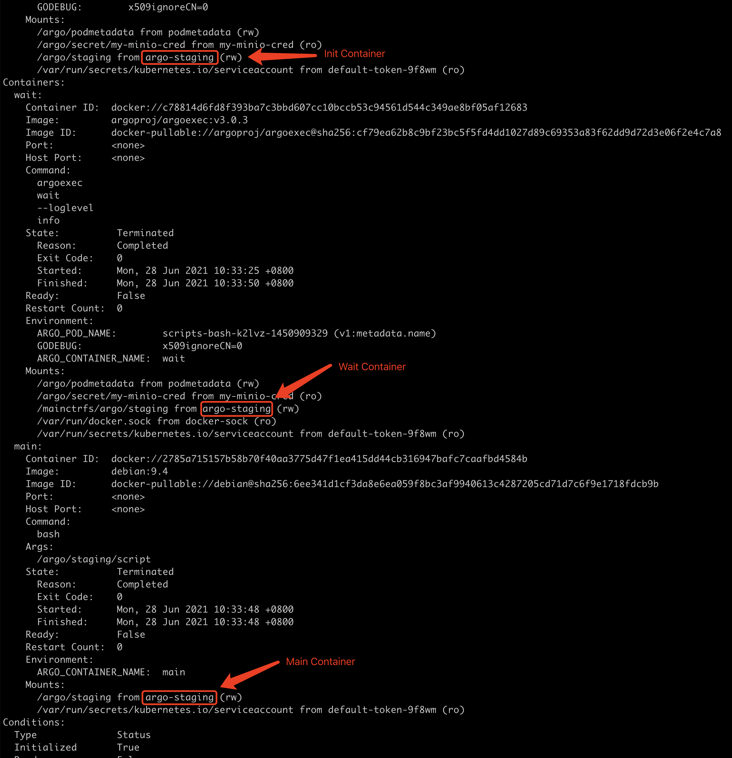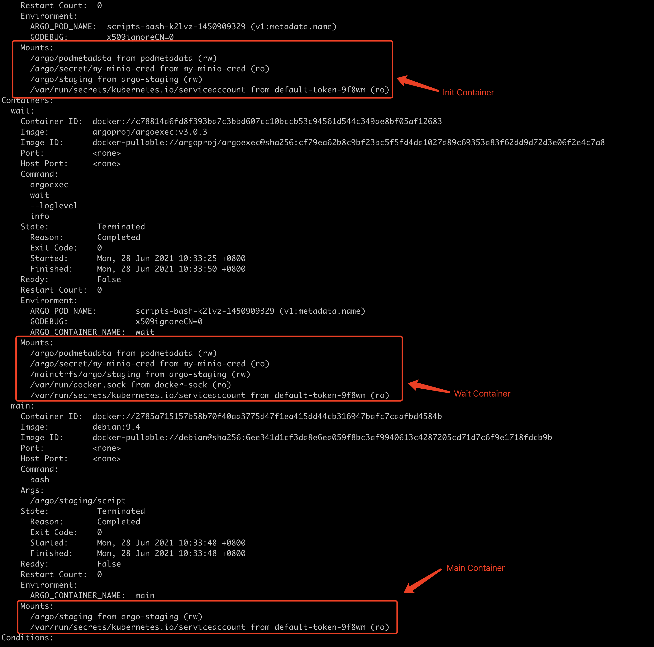e)addInitContainers & addSidecars & addOutputArtifactsVolumes 将Main Containers中的Volume同步挂载到Init/Wait Containers中,以便于共享数据。从一个示例可以看到,Main Containers中的Volume在Init/Wait Containers中都有。