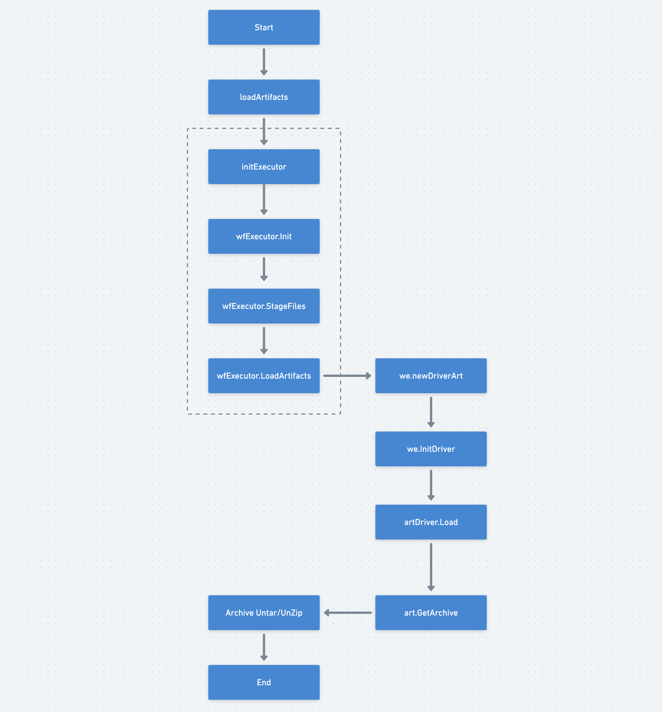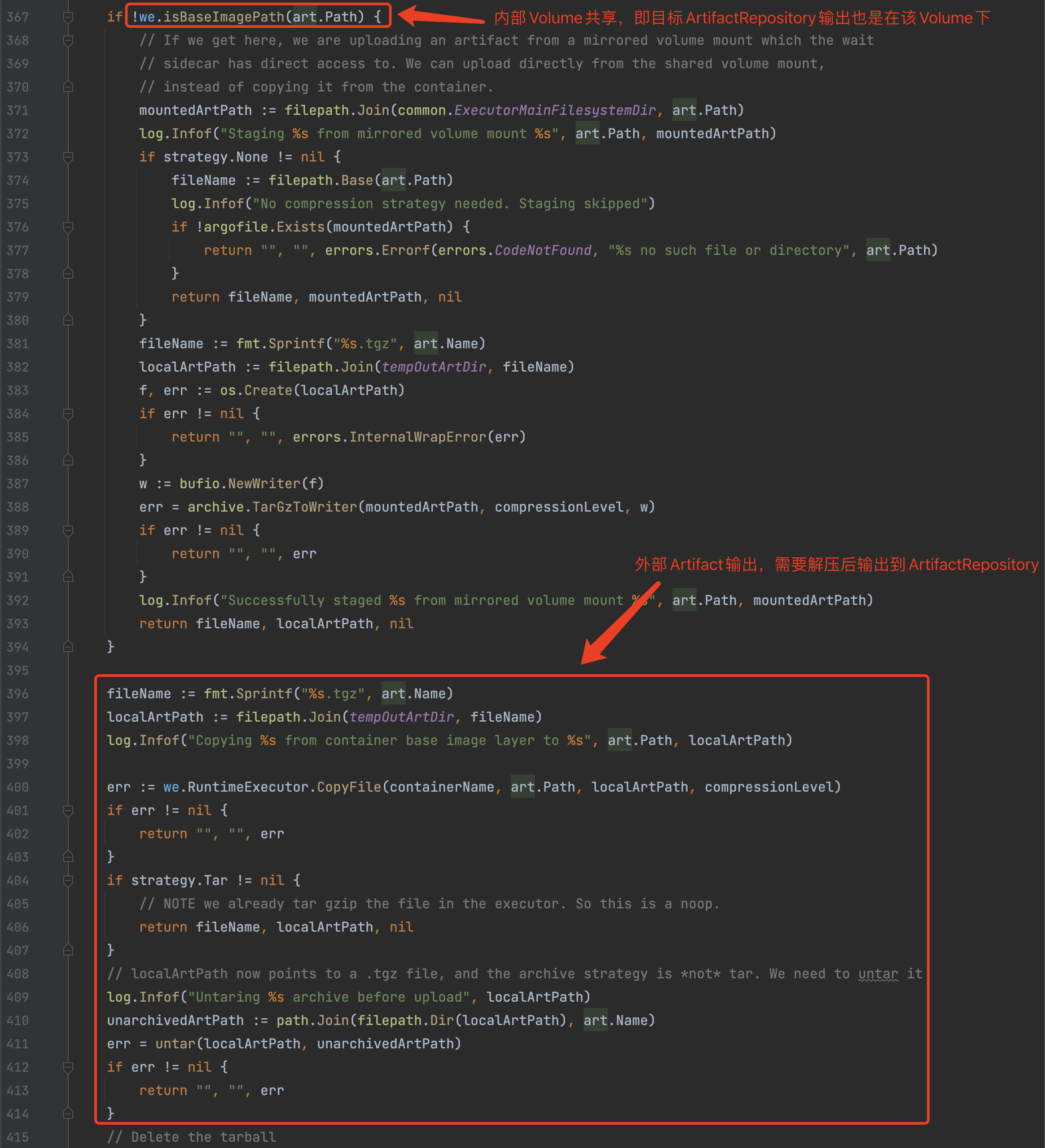 该方法仅在使用了Artifacts功能的场景下有效。负责将配置的Artifact拉取到本地,并根据压缩策略进行解压,修改权限,以便下一步Main Container访问。为便于扩展,Artifacts使用了ArtifactDrive接口设计,不同类型的Artifact可以分开实现,并根据类型进行引入,通过接口进行使用。