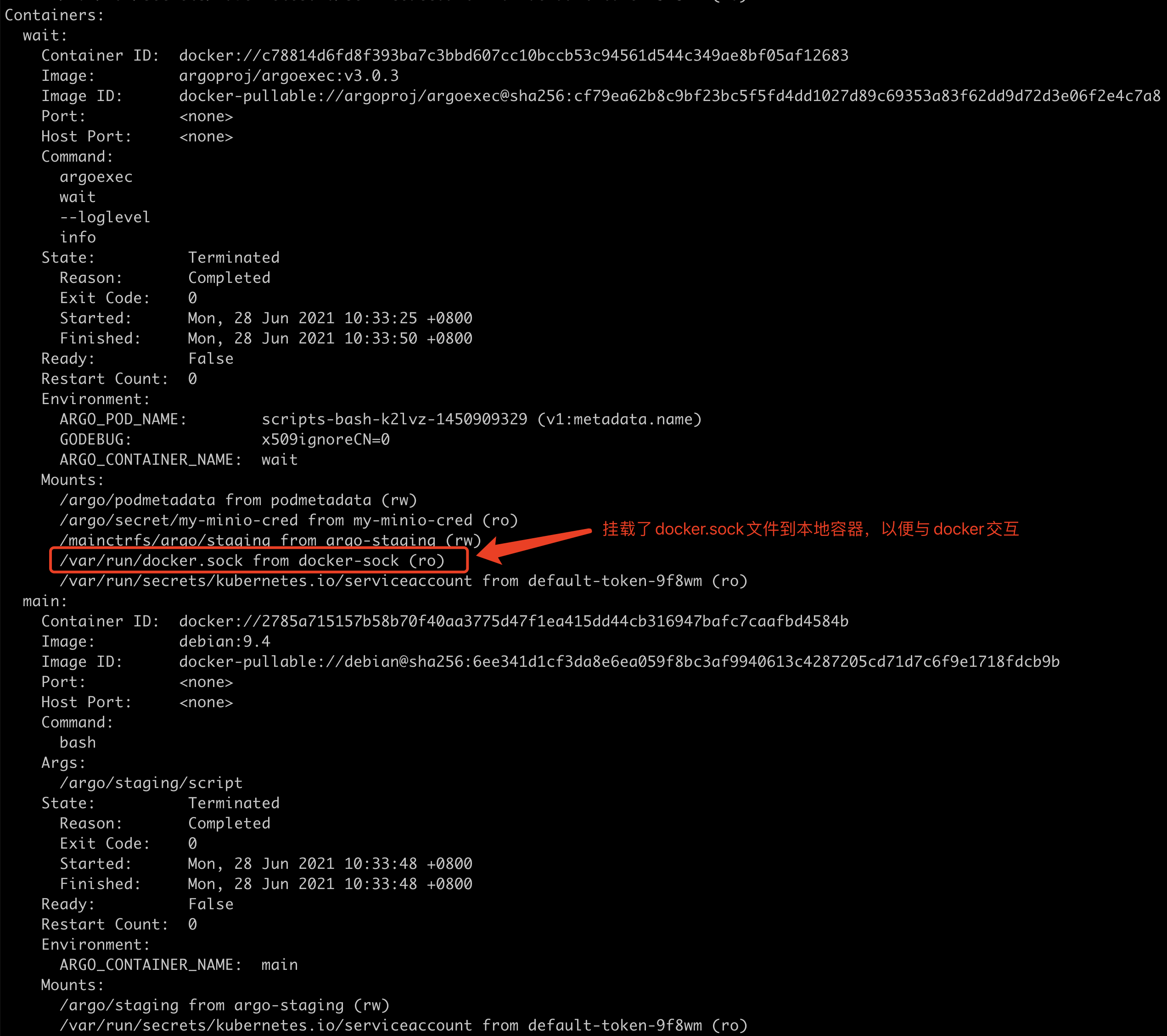 可以看到,容器中挂载了docker.dock文件到本地,以便本地可以通过docker命令与docker进行交互。当然Init Container不会直接与Docker交互,往往只有Wait Container才会,所以Init Container中并没有挂载该docker.sock文件。
