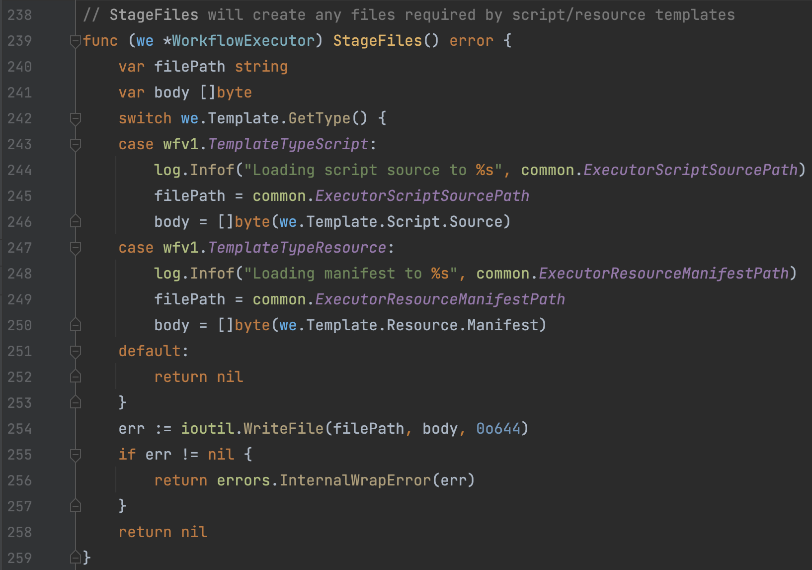wfExecutor.StageFiles方法用于将Script/Resource(如果有)以文件形式存写入到本地挂载的Volume位置,这些Volume是Container之间共享后续操作,后续Main Container会通过共享Volume访问到这些文件。需要注意的是,不同的Template类型,内容来源以及写入的磁盘位置会不同: