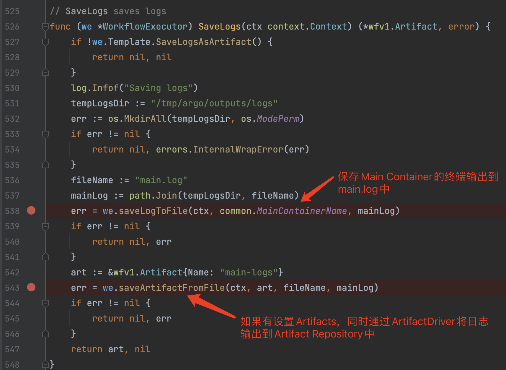 保存日志,默认情况下会保存到argo自带的minio服务(使用S3通信协议)中,该日志也可以被Argo Server中访问展示。