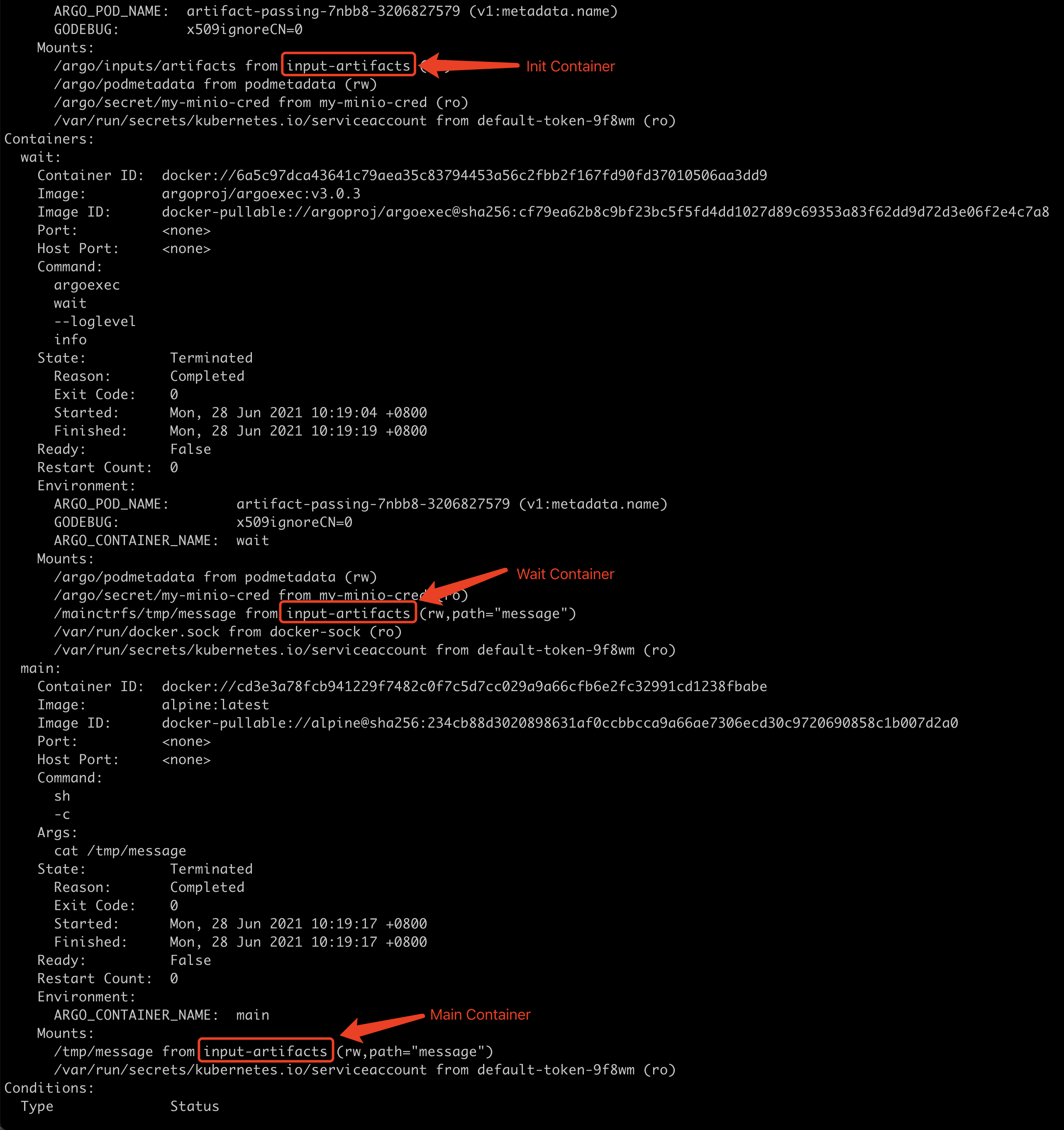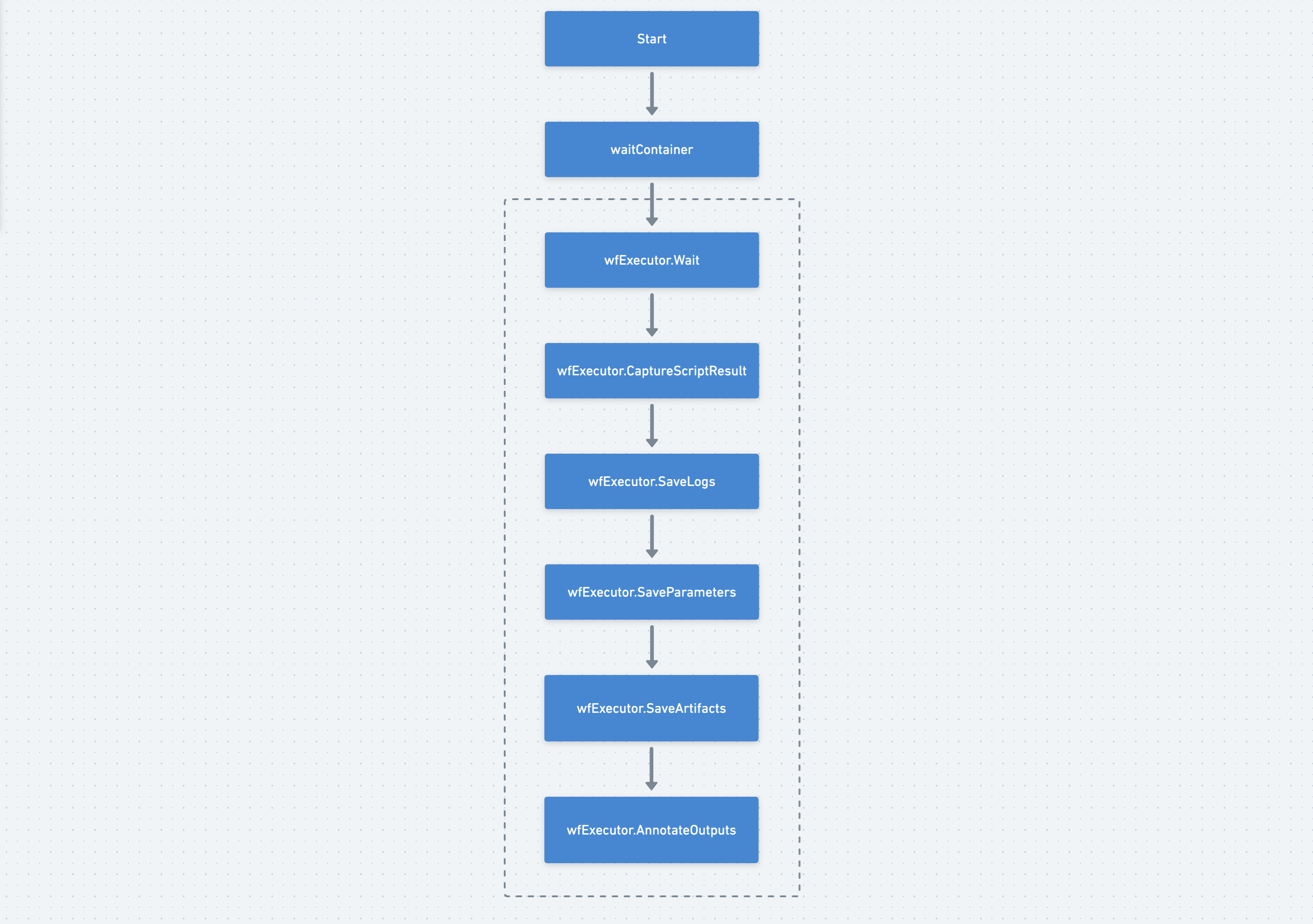 所有的Argo Workflow Template在执行时都会创建一个Wait Container,这是一个非常关键的Container。该Container负责监控 Main Container的生命周期,在 Main Container 中的主要逻辑运行结束之后,负责将输出部分读取、持久化,这样 Main Container 就不用操心如何将该步产生的结果传到后面的步骤上的问题。