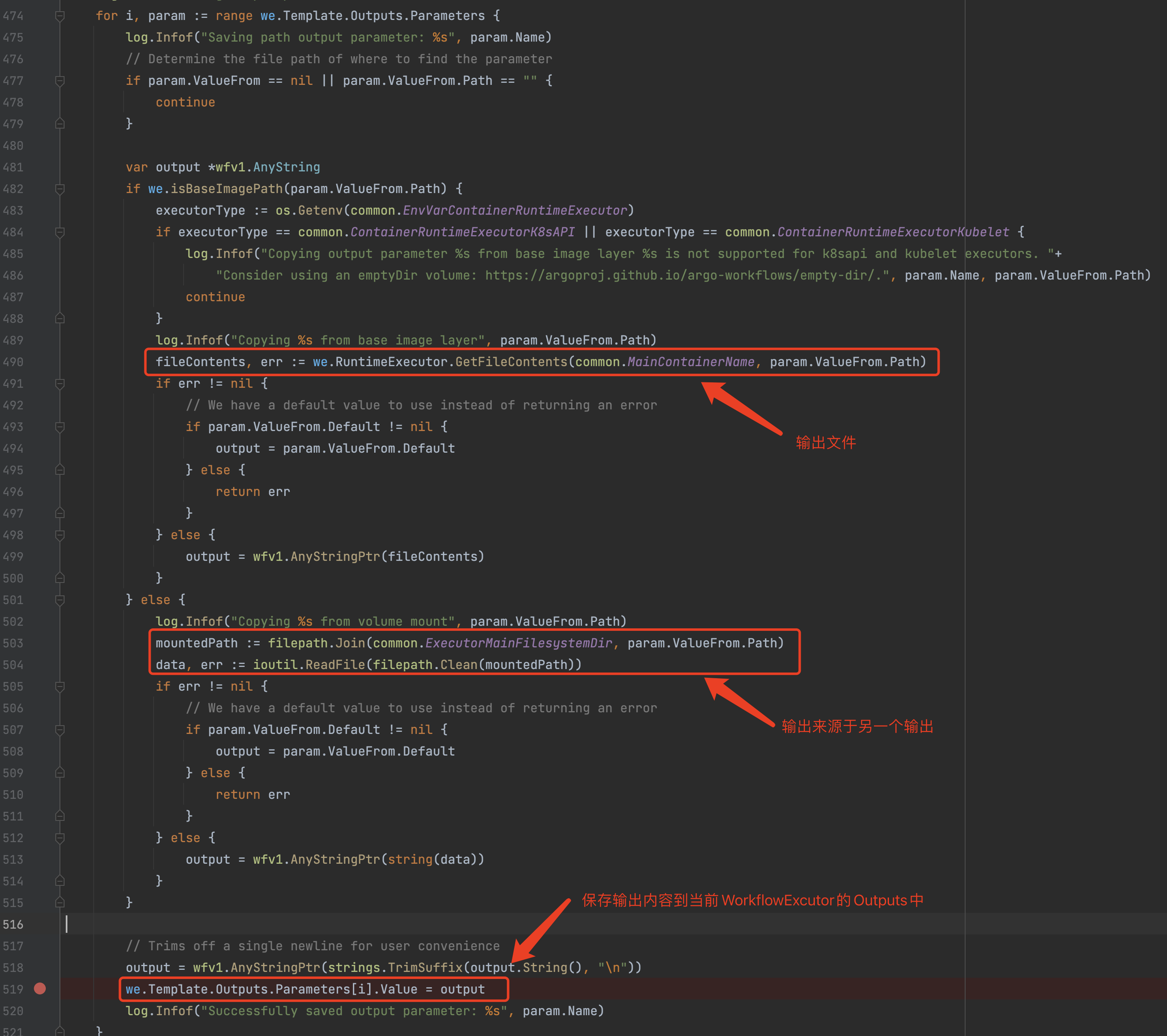 只有在Template中存在Outputs配置时才会执行该逻辑,该方法将容器执行的结果保存到当前 Template.Outputs.Parameters 中。