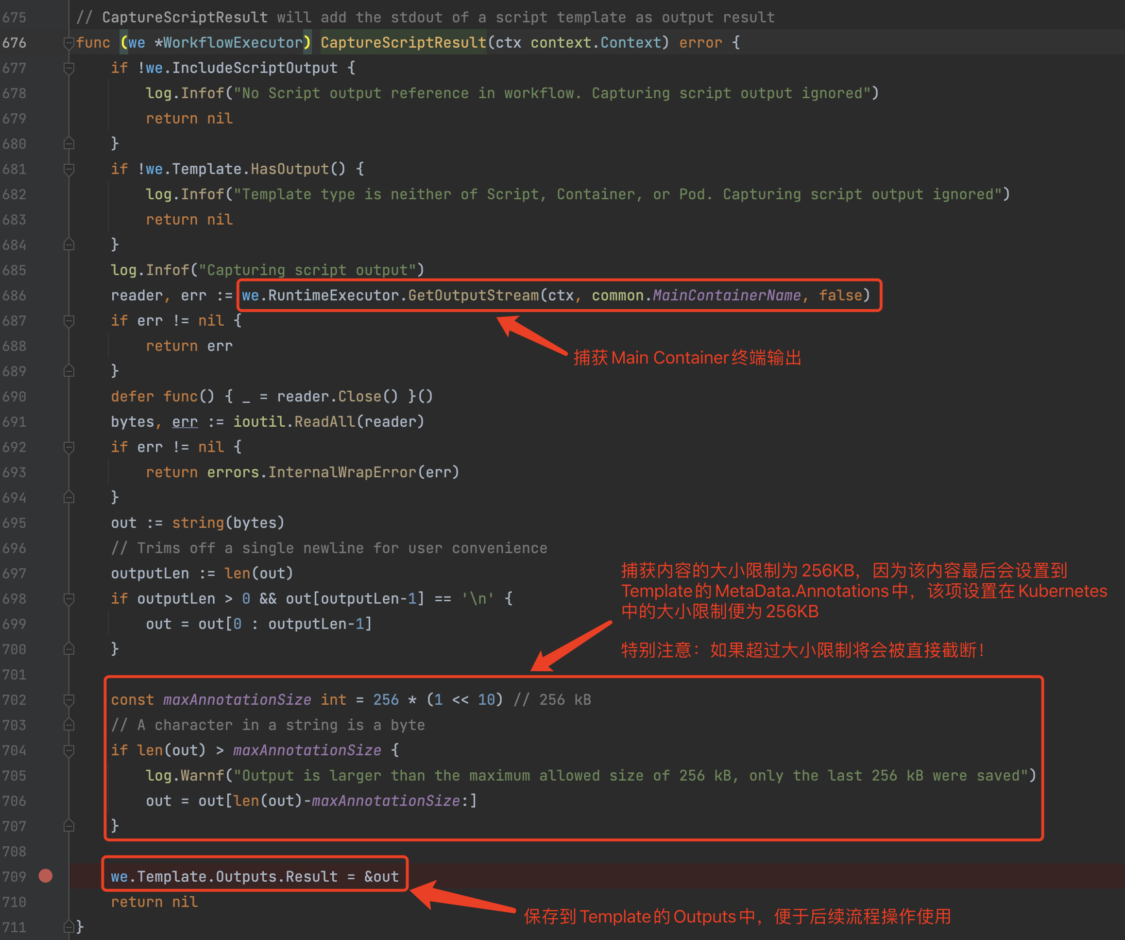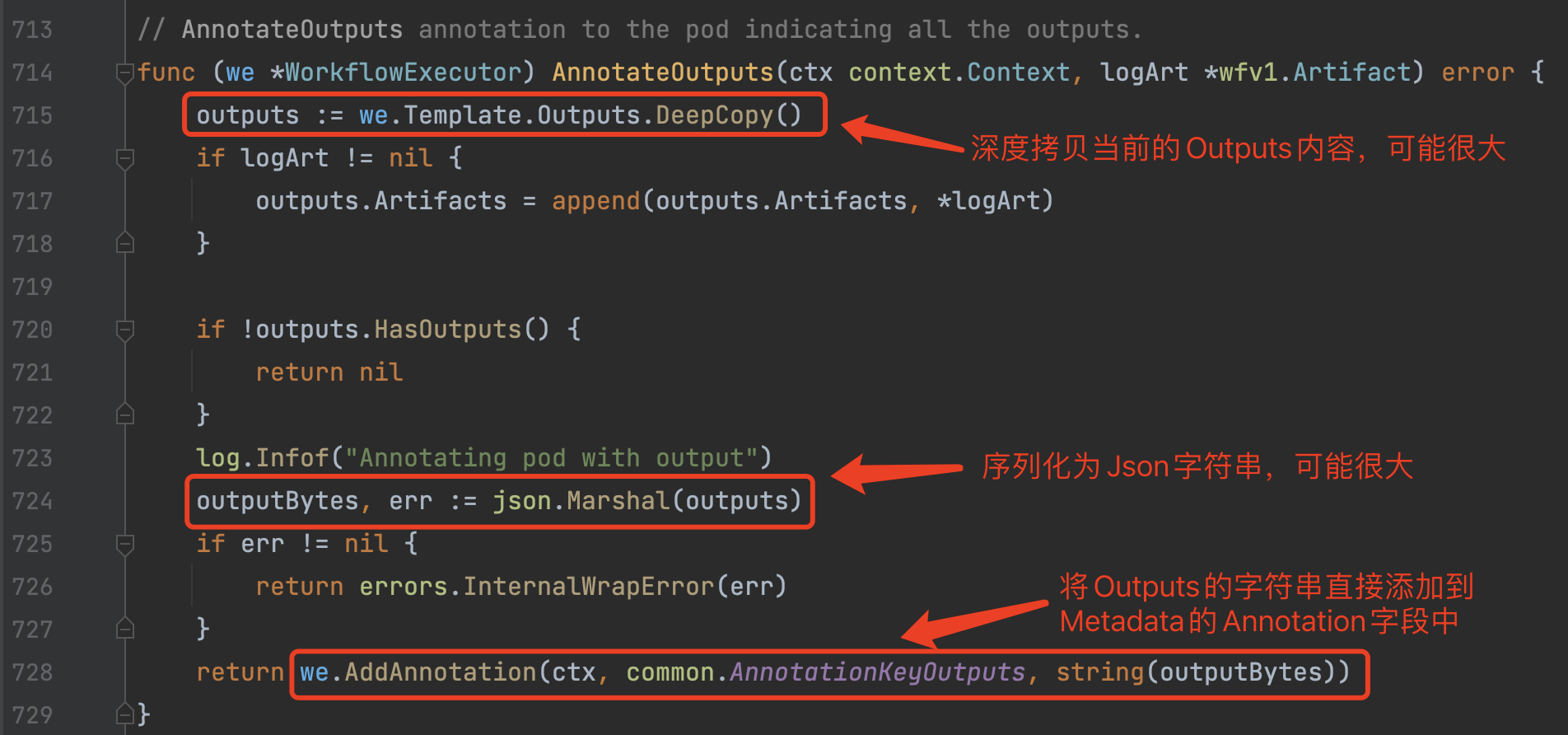 这个Annotations会在Workflow Controller调度时被自动读取出来设置到Template的Outputs属性中,这样一个Template执行的输出便可以被其他关联的Template引用到: