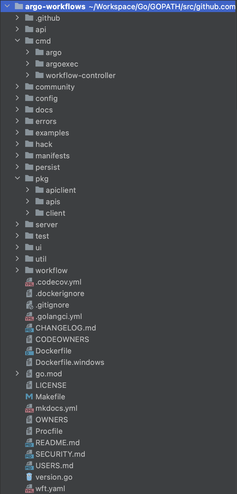 Argo Workflow的整个工程是使用经典的kubebuilder搭建的,因此大部分目录结构和kubebuilder保持一致。关于kubebuilder的介绍可参考:https://cloudnative.to/kubebuilder/